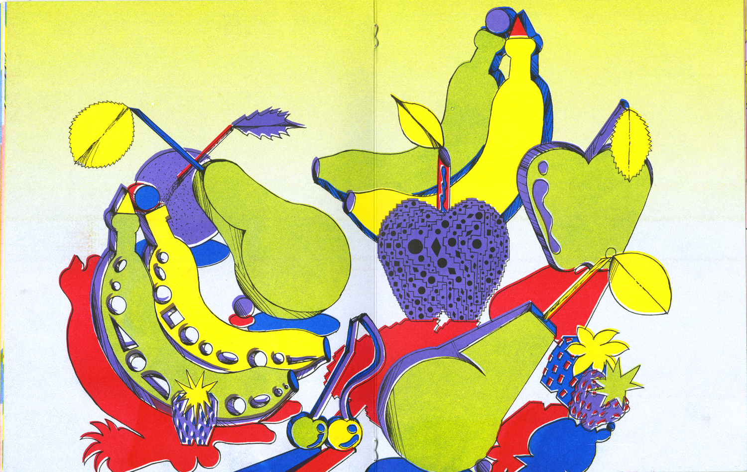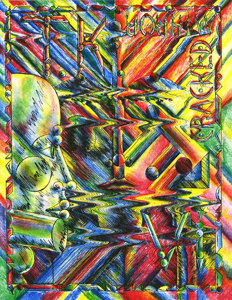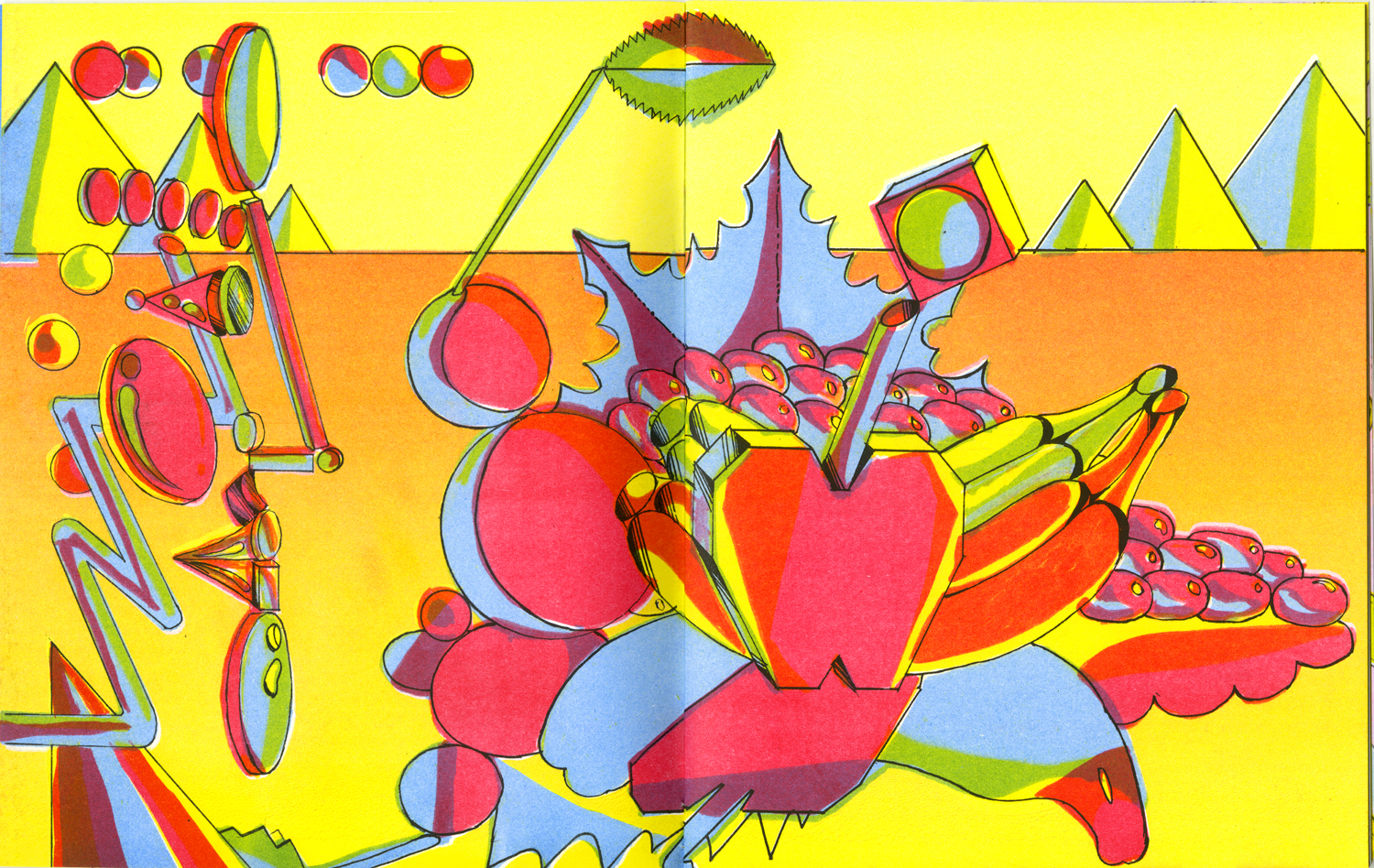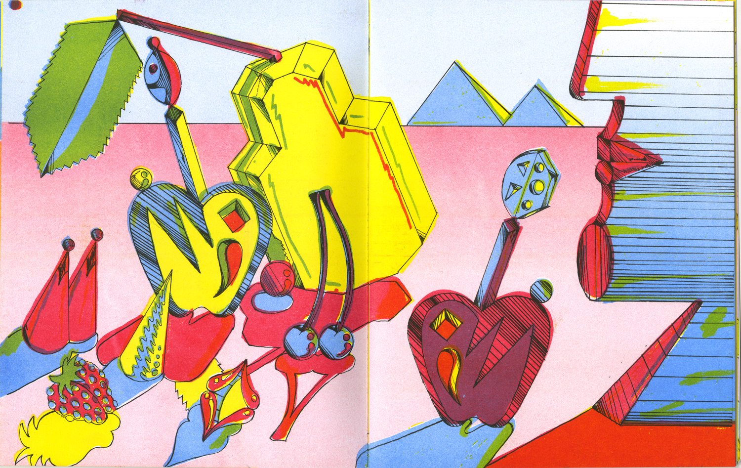 Megalith 6: Inside is the latest publication of works by Mega Press founder Panayiotis Terzis. This edition feature a series of drawings created during the first year of the SARS-COV-19 pandemic in a combined analog and digital drawing technique. Featuring recurring images of geometric fruits arrangements, stoic or expressive cyborg faces, and stiff, digital landscapes, this body of work conveys a feeling of the “sci-fi domestic” during lockdown.